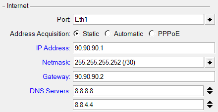 − adres IP interfejsu WAN: 90.90.90.1/30