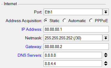 – adres IP interfejsu WAN: 88.88.88.1/30