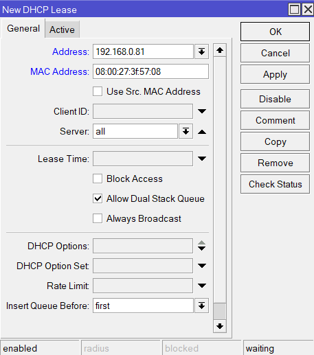 - Przejdź do Leases (IP -> DHCP Server -> Leases)